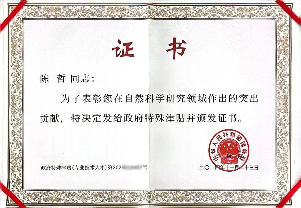 近日,经党中央、国务院批准,人力资源和社会保障部公布2024年享受政府特殊津贴人员名单,英国上市公司365陈哲教授成功获批享受国务院政府特殊津贴。国务院颁发了证书,表彰陈哲教授在自然科学研究领域作出的突出贡献。