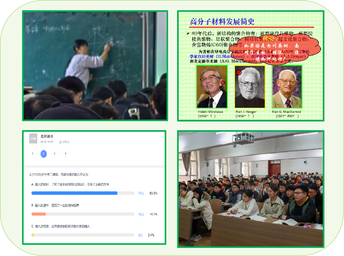 教学中,教师结合材料化学专业课程内容的特点,多维度多角度审视课程结构框架,深入挖掘内在的思政元素,精准提炼思元素政与专业知识的契合点;借助多样化教学手段及实践训练,以多元素融合、实践认知训练、个性化培育为手段,潜移默化实现教师、学生、课程三位一体的“课程思政”建设,最终实现培养既具有扎实专业知识同时又具有执着信念、家国情怀的,能够正确认识时代责任、历史使命的,用中国梦激扬青春梦的新时代德才兼备的优秀人才。